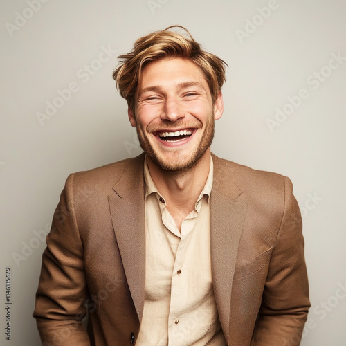 Confident and delighted European man in his 30s with medium blonde hair wearing a brown suit and tie, expressing happiness and friendliness.