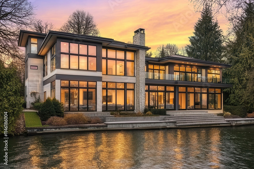 Modern lakeside house with large windows and sunset view