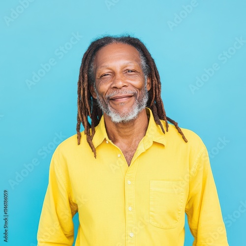 Portrait of a smiling Jamaican man in yellow shirt against blue