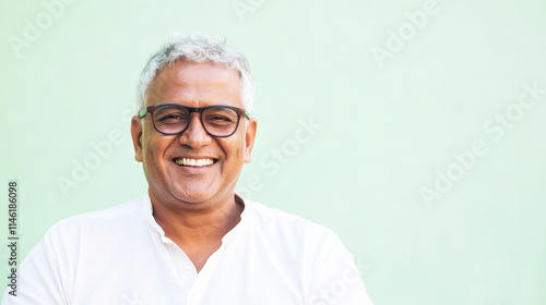 Confident Hispanic man in his 50s with a poised expression, short gray hair, and a white shirt against a neutral background