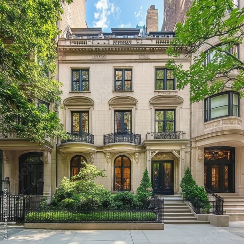 Modern townhouse architecture in urban New York setting with greenery