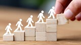 Businessman hand builds wooden block steps with paper people showing growth and progress