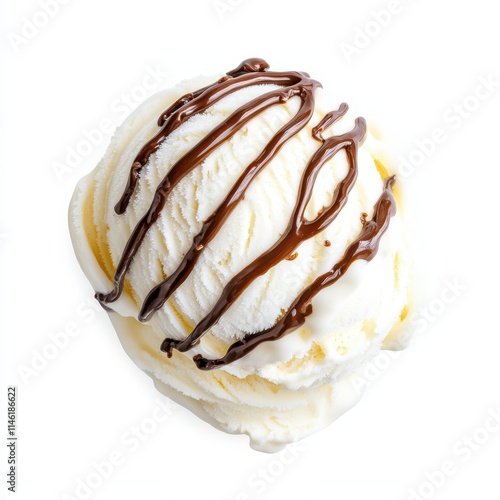 Isolated top view of creamy vanilla ice cream scoop drizzled with rich chocolate syrup on white background