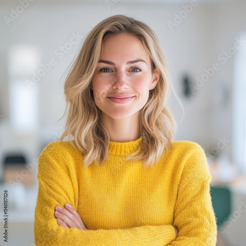 Smiling young businesswoman in casual office attire standing in a modern workspace