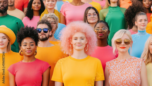 Group portrait of diverse individuals wearing colorful clothing, looking expressive and confident