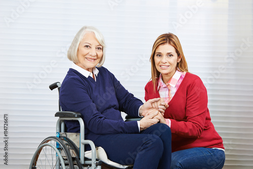 Lächelnde Frau umarmt Senior im Seniorenheim