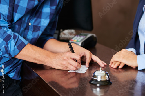 Gast bezahlt Hotel Rechnung mit Smartphone