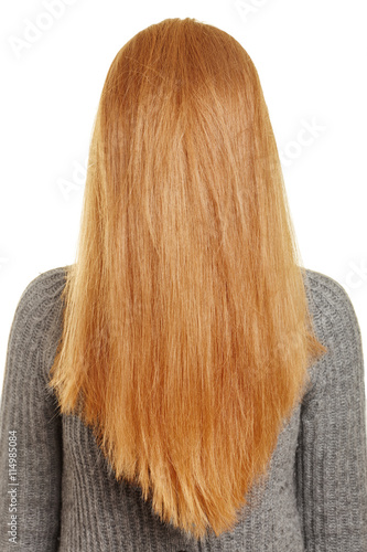 Back view of a girl with long, shiny hair wearing a light blue shirt against a teal background