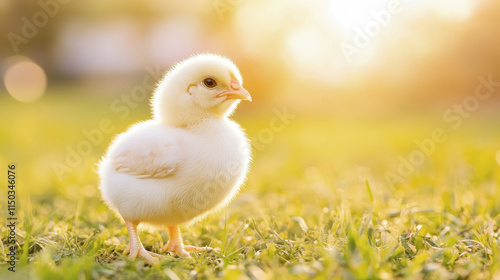 Adorable chick standing on grassy field during golden hour lighting