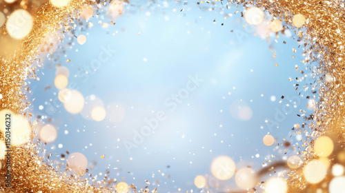 Sparkling blue and gold glitter background with stars and bokeh lights for festive celebration and magic vibes.