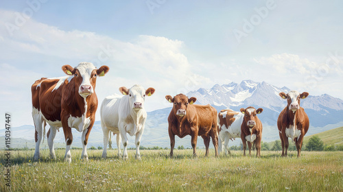 Two Brown Cows Standing in a Field with Mountain Backdrop