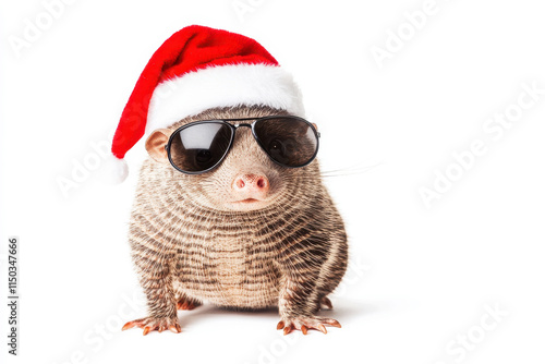 Cute armadillo wearing sunglasses and Santa hat for a Christmas celebration