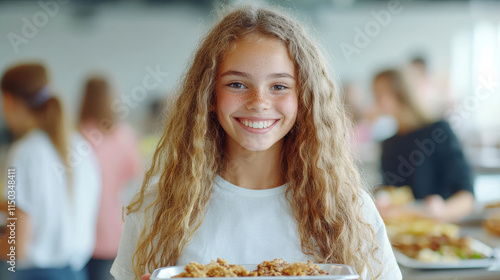 Cheerful girl holding food tray surrounded by friends in a communal eating area