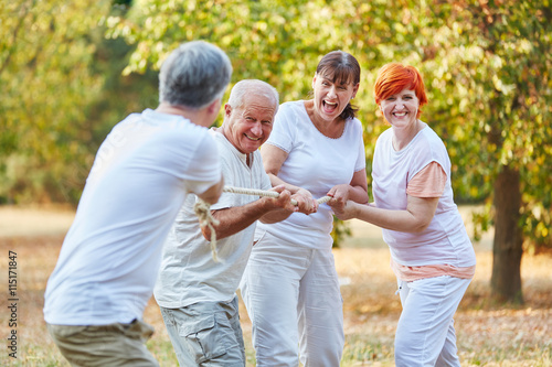 Gruppe Senioren beim Tauziehen im Park