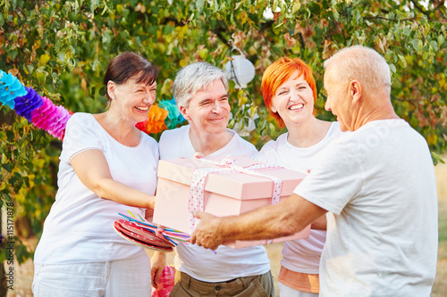 Lachende Senioren bei Geburtstagsfeier mit Kuchen
