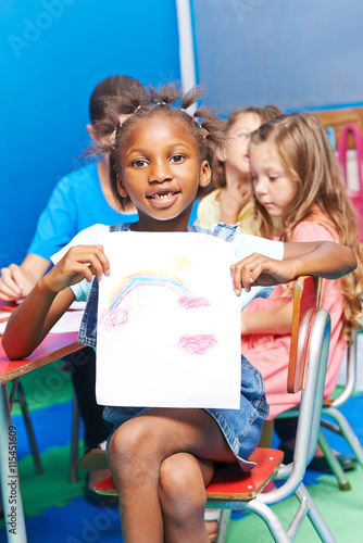 Mädchen zeigt gemaltes Bild im Kindergarten