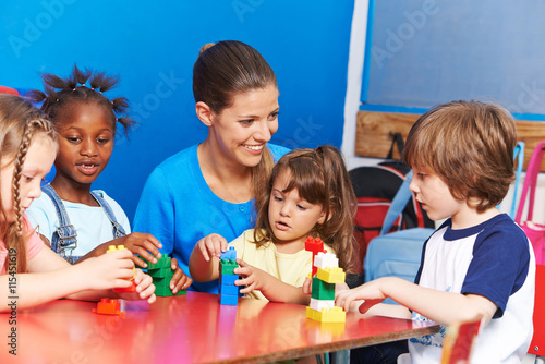 Kinder bauen mit Bausteinen im Kindergarten