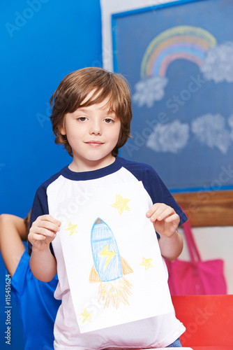 Kindergärtnerin mit Gruppe Kinder hält Daumen hoch