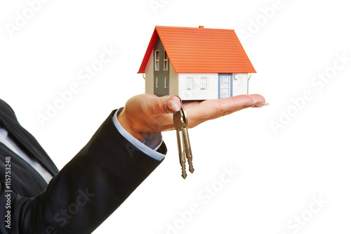 Haus mit Schlüssel auf Hand als Hausbau oder Hauskauf Konzept