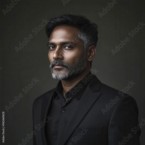 Portrait of a determined Hispanic man in his 40s wearing a suit and tie, conveying confidence and professionalism