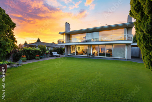 Charming 1960s modern ranch-style house with large windows and lush lawn