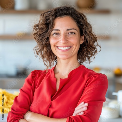 Confident businesswoman smiling in a vibrant red sweater indoors