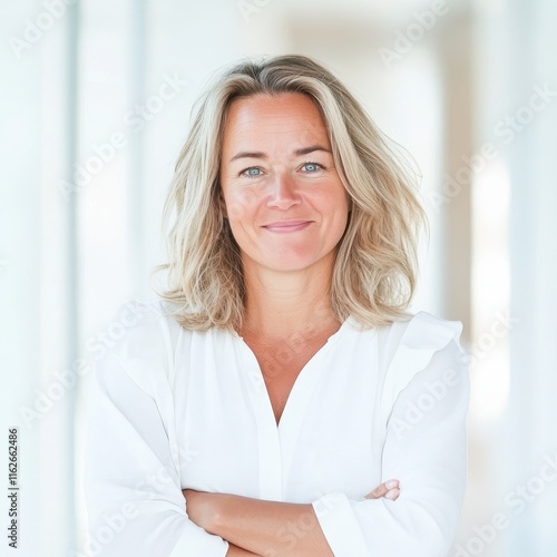 Serene portrait of a Norwegian woman in her 50s with medium-length blonde hair and a calm expression in natural lighting