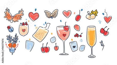 Colorful hand-drawn doodles of love, drinks, and cherries for Valentine's Day