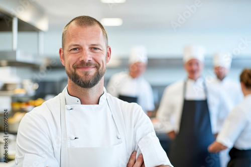 Full body shot of a friendly female chef in professional uniform smiling and posing confidently