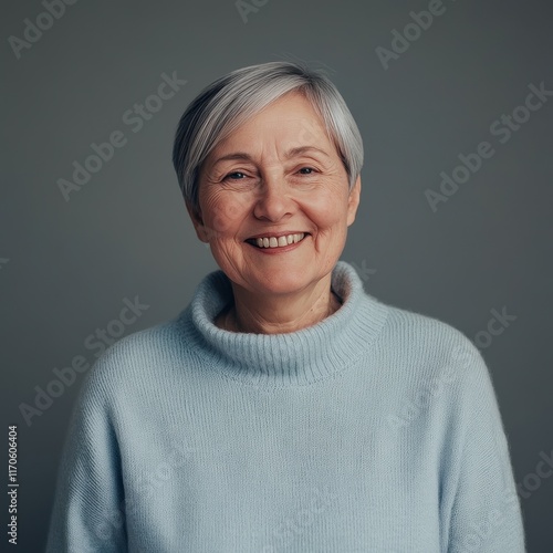 Portrait of a smiling silver-haired senior woman in a navy blazer, exuding confidence and elegance.