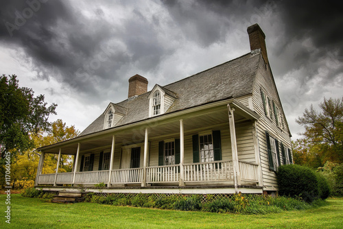 Colonial American house from the 1700s with stormy sky
