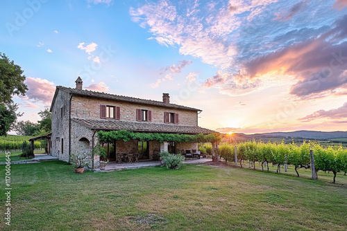 Stunning 1700s Italian farmhouse at sunset with vineyard view
