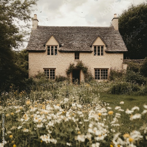Charming rustic English farmhouse surrounded by wildflowers on a sunny day