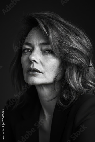 Black and white portrait of a confident Swiss woman in striking elegance