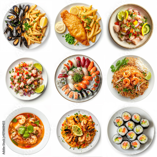 Assorted international cuisines presented on white background in a collage of dishes