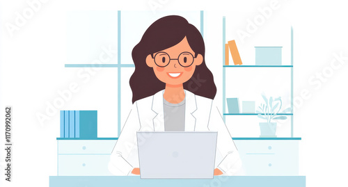 Smiling businesswoman sitting at desk with a laptop in bright office