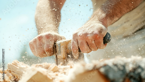 Carpenter shaping wood with a woodworking tool under bright sunlight
