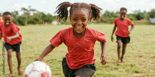 Children playing soccer outdoors with joy and energy under a sunny sky