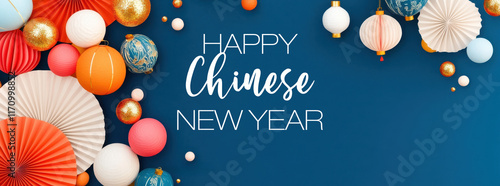 Happy Chinese New Year celebration with lanterns and decorative elements on blue background