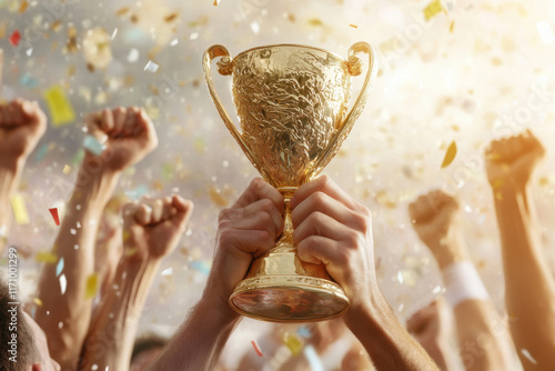 Golden trophy held high amidst a celebratory crowd in festive atmosphere