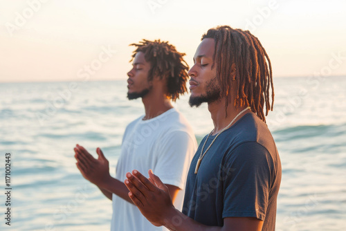 Two individuals meditating peacefully by the ocean during a serene sunset