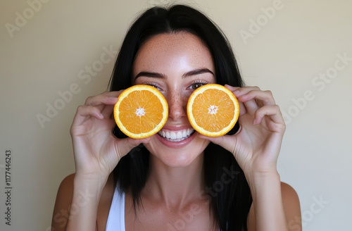 Portrait of a beautiful woman holding an orange slice and smiling brightly