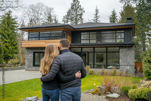 Young couple standing together looking at a modern house surrounded by greenery