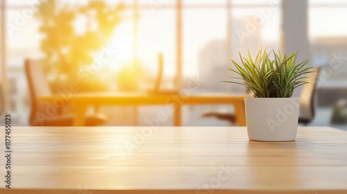 A clean and modern workspace with a focus on a wooden desk and a potted plant, conveying a sense of productivity and tranquility in an office setting.