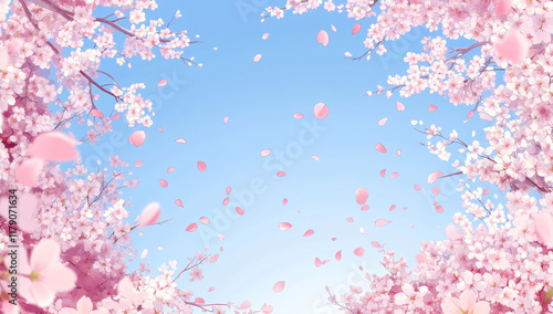 Pink cherry blossoms blooming against a vibrant blue sky in spring season