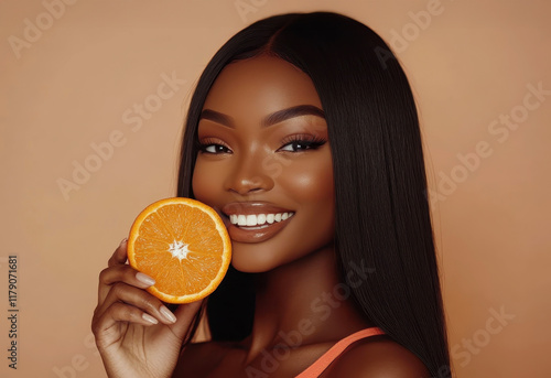 Portrait of a beautiful woman holding an orange slice and smiling brightly