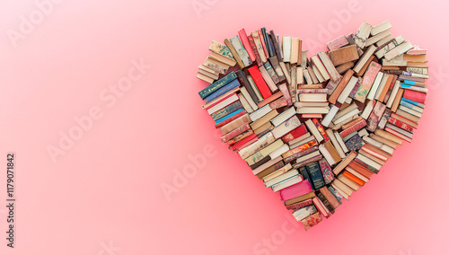 Heart-shaped arrangement of books symbolizing love for reading on pink background