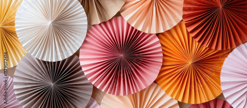 Colorful paper fans arranged artfully in various sizes and tones