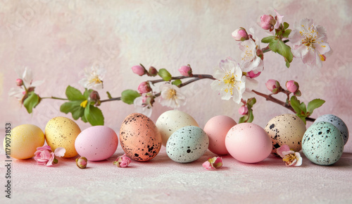 Decorative speckled Easter eggs and spring blossoms on a soft pastel background