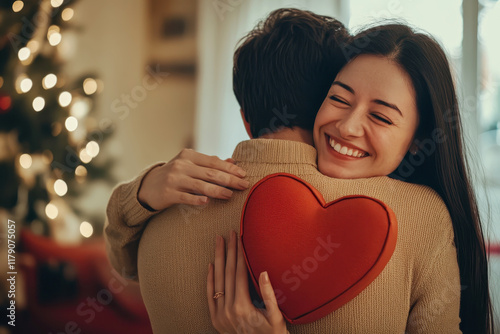 Smiling woman holding a heart-shaped gift during Valentine’s Day celebration